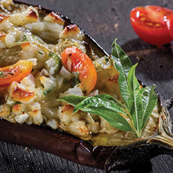 Γεμιστή μελιτζάνα με χαλούμι και ντοματίνια