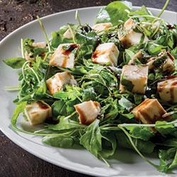Ανακατεύετε σε ένα μπολ το λάδι, την σκόνη μουστάρδας, το σκόρδο, τα μυρωδικά και το βαλσάμικο και προσθέτετε το χαλούμι σε κύβους. Αφήνετε να μαριναριστεί για τουλάχιστον μία ώρα.